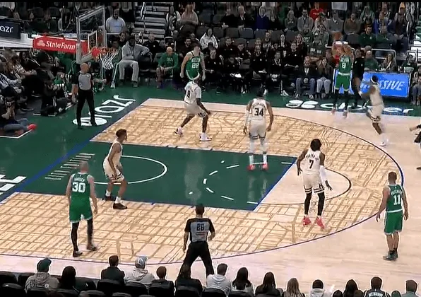 虎扑03月03日讯 NBA常规赛,凯尔特人客场对阵雄鹿的比赛正在进行中。